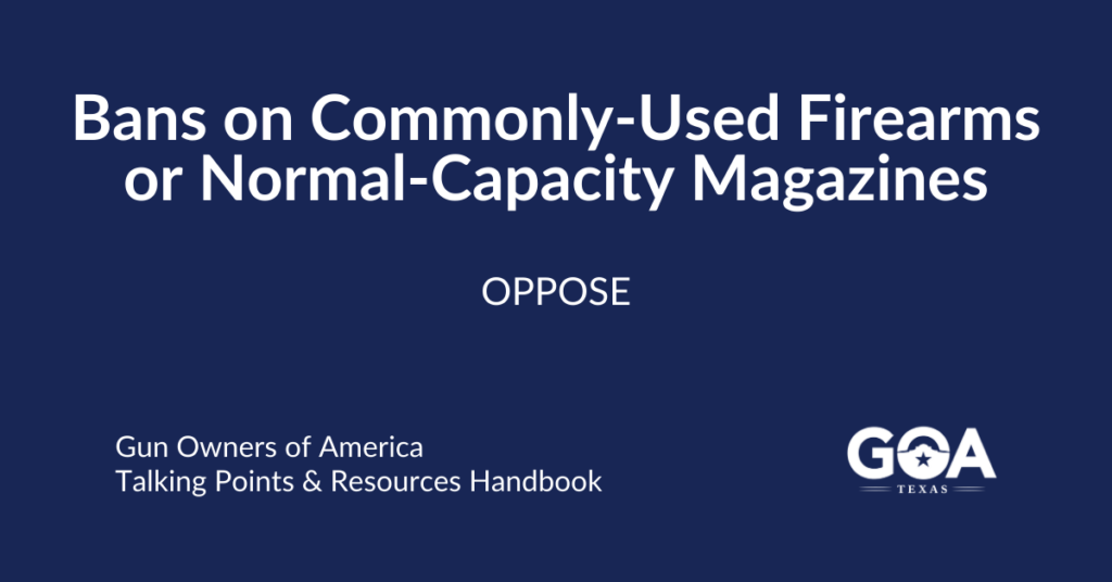 Bans on Commonly-Used Firearms or Normal-Capacity Magazines See also discussion and points for how to talk about this issue under Constitutional Carry and Ending “Gun-Free” Zones, showing how important it is for us to be able to use firearms to stay safe. GOA’s Position Commonly owned firearms such as AR-15s and semi-automatic shotguns and magazines […]