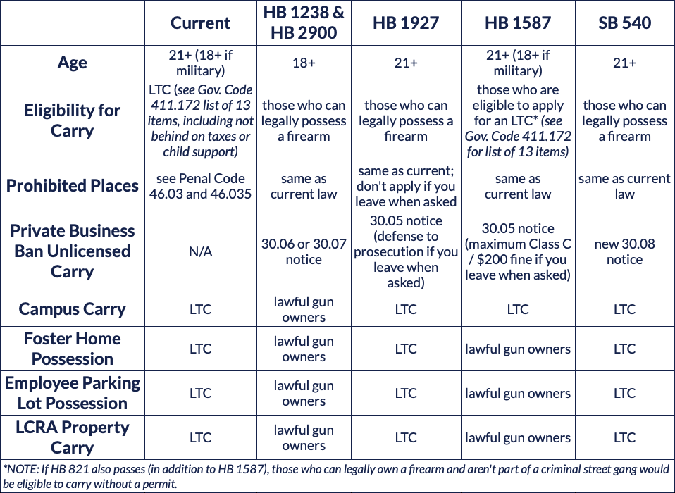 - SUPPORT: HB 1094 by Rep. Oliverson would allow anyone over 18 who can legally possess a firearm and who is protected by a protective order or emergency restraining order to carry a handgun, open or concealed, without a license. It would also exempt such people from “gun-free” zones listed in Texas Penal Code 46.03 and 46.035.